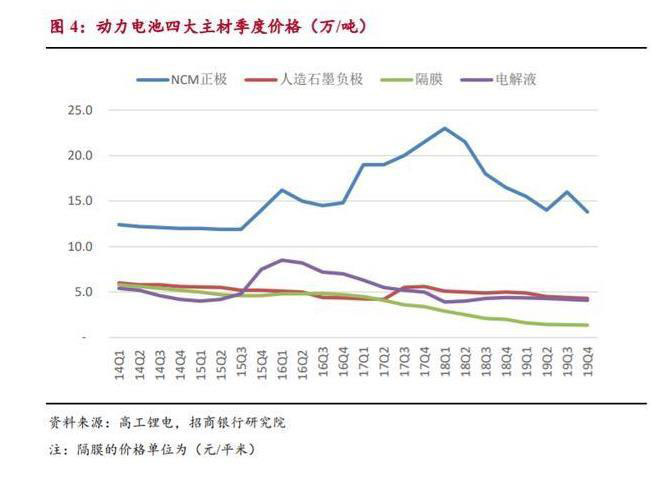 上游供給側(cè):原材料成本逐年下降,利好動力電池成本控制。動力電池上 游原材料中最重要的是四大主材:正極材料、負極材料、隔膜、電解液。隨著 中國新能源汽車市場的崛起,國內(nèi)形成了完整的動力電池原材料產(chǎn)業(yè)集群,其 中四大主材的國產(chǎn)化率均在 90%以上。經(jīng)過前期供需關(guān)系轉(zhuǎn)變和鋰鈷資源價格 波動,受益于規(guī)?;?yīng)、自動化率提高和競爭格局的加劇,四大主材的價格 呈現(xiàn)逐年下降的態(tài)勢。相較 2018 年 Q1,2019 年 Q4 正極、負極和隔膜的價格 分別下降 40.0%、15.7%、53.4%,降幅顯著。而電解液價格維持在 4 萬/噸左 右,整體上略有下降。上游供給側(cè)原材料成本的下降,利好動力電池成本控制。