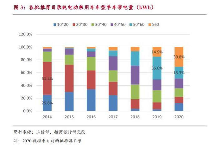 續(xù)航里程需求驅(qū)使,單車帶電量顯著提升。新能源汽車的動力來源是車載 動力電池系統(tǒng),車輛的續(xù)航里程主要由電池系統(tǒng)帶電量和百公里電耗決定。目 前提升車輛續(xù)航能力最直接的策略就是增加整車帶電量,如優(yōu)化車身結(jié)構(gòu)以增 加電池數(shù)量或選配能量密度更高的動力電池。工信部公布的各批次純電動乘用 車性能參數(shù)顯示,2014 年以來單車帶電量顯著提升。2014 年大部分車型帶電 量在 20~30kWh 區(qū)間,占比為 51.2%。2019 年大部分車型帶電量在≥50kWh 區(qū) 間,接近 2014 年的兩倍。而 2020 年公示的車型中,單車帶電量≥60kWh 的車 型占比達 30.8%,相較 2019 年上升了 15.9 個百分點,增速顯著。受益于續(xù)航 里程的持續(xù)提升,新能源汽車單車電量持續(xù)提升的趨勢短期不會改變。預(yù)計 2021 年推出的純電動乘用車中帶電量≥60kWh 車型占比有望達到 50%左右,有 利于帶動動力電池的需求。