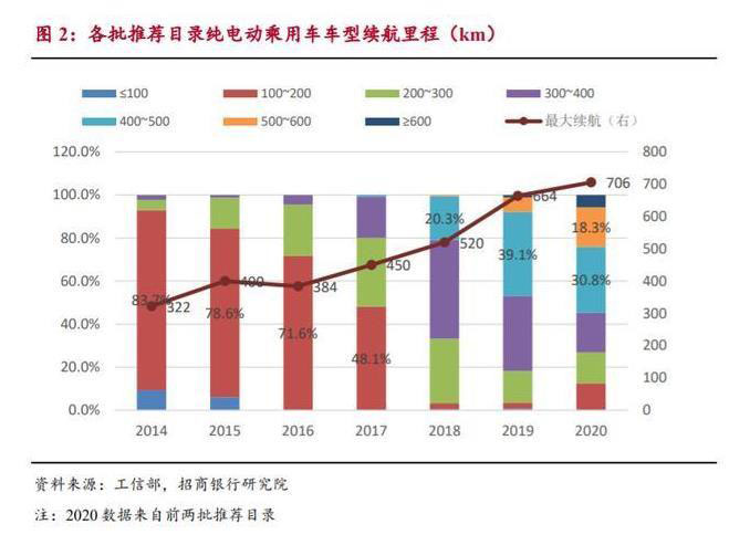 技術(shù)與政策雙驅(qū)動,續(xù)航里程顯著提升。續(xù)航里程一直以來是新能源汽車 的行業(yè)痛點之一,也是消費者對新能源汽車望而卻步的主要因素之一。近年來, 隨著動力電池技術(shù)的進步,輔以補貼政策的積極引導(dǎo),新能源汽車的續(xù)航里程 顯著提升。迄今為止,工信部共公布三十一批《免征購置稅的純電動乘用車車 型目錄》, 2014 年大部分車型續(xù)航里程在 100~200km,占比高達 83.7%。 2014 年以來續(xù)航里程逐年提升,最大續(xù)航里程已由 322km 提高至 706km,增 速顯著。最近三年續(xù)航里程以每年接近 100km 的速度顯著提升,2019 年公示 的大部分車型續(xù)航在 300~500km 區(qū)間,其中 400km 以上續(xù)航里程的車型占比 為 46.9% 。而 2020 年公示的兩批目錄中,大部分車型的續(xù)航里程在 400~600km,其中 400km 以上續(xù)航里程的占比為 54.8%,相較 2019 年提高了 7.9 個百分點。在最新公布的補貼方案中,已將純電動乘用車續(xù)航里程補貼門 檻提高至 300km。伴隨著消費升級和行業(yè)競爭加劇趨勢,預(yù)計后續(xù)除特定應(yīng)用 場景之外,低續(xù)航里程的車型逐漸會被淘汰,高續(xù)航里程的車型占比會逐年提 升。預(yù)計 2021 年推出的純電動乘用車中續(xù)航里程在 400km 以上的車型占比可 以達到 80%左右,最大續(xù)航里程有望達到 800km 左右。