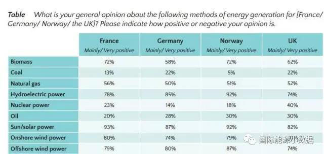 在法國,最受歡迎的能源是太陽能發(fā)電,93%的受訪民眾給予正面評價;其次是陸上風電(80%)、海上風電(79%)、水電(78%)、生物質(zhì)(72%)、天然氣(56%)。值得注意的是,在以核為主的法國,民眾其實并不喜歡核電,只有23%的民眾給予正面評價;僅高于石油(20%)、煤電(13%)。