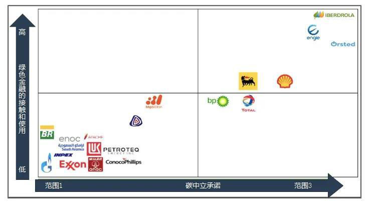 仔細(xì)觀察圖1可以發(fā)現(xiàn),碳中立承諾范圍大的公司基本集中在歐洲國家,其他國家的公司很少有想要做出改變的意向。由于強(qiáng)有力的環(huán)境政策框架,歐洲在可持續(xù)發(fā)展方面處于領(lǐng)先地位。法國Engie[6]、丹麥?rsted[7]和西班牙Iberdrola[8]幾乎成功地走上了符合《巴黎協(xié)定》目標(biāo)的脫碳道路,并承諾在2050年前實(shí)現(xiàn)碳中立。這三家公司均已開始能源多元化進(jìn)程,并都從化石燃料中撤資,轉(zhuǎn)投可再生能源。政府也助力于他們的綠色轉(zhuǎn)型,例如歐盟頒布有關(guān)環(huán)境披露的法律和強(qiáng)制性污染責(zé)任政策、制定碳排放交易體系,以及各國不斷增加可再生能源的補(bǔ)貼等。與此同時(shí),利益相關(guān)者的參與和非政府組織對石油和天然氣巨頭的壓力,也從根本上改變了公眾對氣候變化和環(huán)境意識的看法。除上述三個(gè)案例外,其他歐洲化石燃料公司也制定了降低碳排放強(qiáng)度的目標(biāo)。此外,意大利埃尼集團(tuán)(Eni)、荷蘭皇家殼牌(Dutch Shell)、英國石油公司(BP)和英美資源集團(tuán)(Angle American)都受到歐洲環(huán)境標(biāo)準(zhǔn)的影響,采取了適宜的方法來降低碳排放強(qiáng)度[9]。