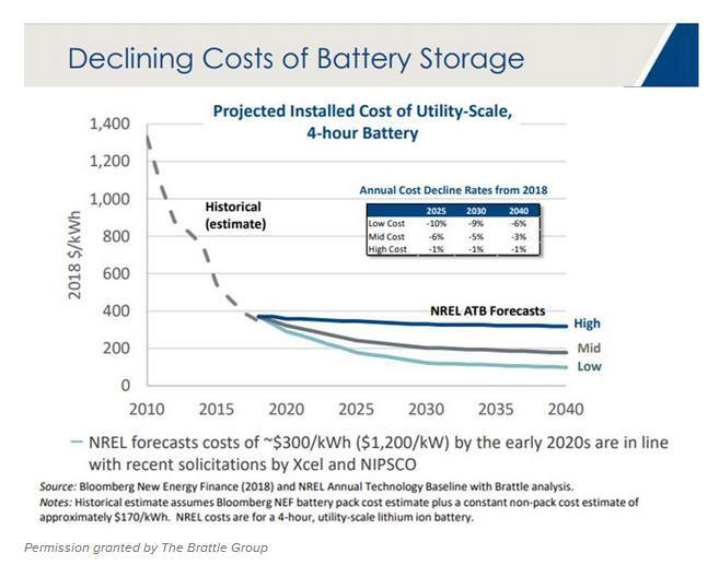 Brattle爾集團(tuán)于5月13日在麻省理工學(xué)院的一次研討會(huì)上發(fā)表的一份演講報(bào)告指出,鋰離子電池儲(chǔ)能系統(tǒng)的成本下降得如此之快,以至于現(xiàn)在對(duì)于其他儲(chǔ)能技術(shù)來說無法在提供可靠性和電網(wǎng)服務(wù)方面與其展開競(jìng)爭。Brattle的報(bào)告聲稱,電池儲(chǔ)能系統(tǒng)的價(jià)格從2010年的1400美元/kWh降至400美元/kWh以下,到2040年可能降到200美元/kWh或更低。