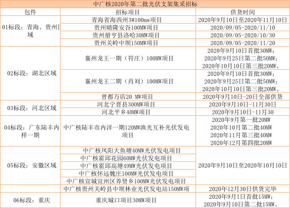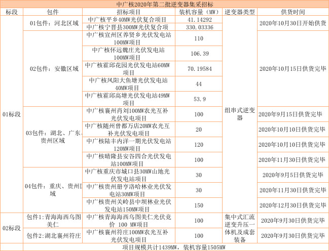 7月15日,中廣核新能源發(fā)布2020年第二批逆變器集采,招標(biāo)容量共計1.5GW。17日,相繼發(fā)布2020年第二批支架招標(biāo)公告,容量總計為1.6GW。具體招標(biāo)詳情見下表格: