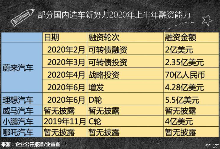 除了銷(xiāo)量成績(jī)單,國(guó)內(nèi)造車(chē)新勢(shì)力們的融資能力也受到各界關(guān)注,畢竟造車(chē)是一個(gè)非?!盁X(qián)”的行業(yè)。蔚來(lái)汽車(chē)的李斌曾表示,“沒(méi)有200億不要造車(chē)”。曾經(jīng)造車(chē)行業(yè)吸金能力十足,但隨著人們對(duì)造車(chē)新勢(shì)力信心的減弱,資本市場(chǎng)上的資金和資源也向著頭部力量靠攏,據(jù)不完全統(tǒng)計(jì),從2019年年底到2020年上半年,造車(chē)新勢(shì)力頭部力量融資能力超過(guò)了200億人民幣。