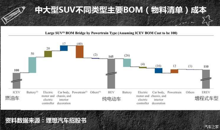 在一眾造車(chē)新勢(shì)力扎堆純電動(dòng)車(chē)型的時(shí)候,理想汽車(chē)獨(dú)辟蹊徑,打造的是增程式車(chē)型,增程式車(chē)型解決了純電動(dòng)車(chē)的續(xù)航短、充電麻煩的問(wèn)題,這可能是理想ONE在對(duì)比電動(dòng)車(chē)時(shí)最大的優(yōu)勢(shì)。此外該解決方案和純電動(dòng)車(chē)相比,能讓理想獲得更多的成本優(yōu)勢(shì),從理想汽車(chē)不久前公布的招股書(shū)中我們可以看到,由于采用較小的電池組,減少車(chē)身和懸架系統(tǒng)昂貴鋁制材料的運(yùn)用,理想ONE的BOM(物料清單)成本接近燃油車(chē)的成本,遠(yuǎn)低于同級(jí)別純電動(dòng)車(chē)的成本。