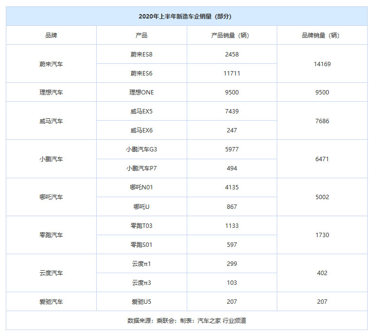 上述幾家企業(yè)都是2020年上半年新勢(shì)力車企中銷量“尖子生”。根據(jù)乘聯(lián)會(huì)最新的統(tǒng)計(jì)數(shù)據(jù),2020年上半年,中國(guó)品牌造車新勢(shì)力銷量排名前五的品牌分別為蔚來(lái)汽車、理想汽車、威馬汽車、哪吒汽車和小鵬汽車,它們累計(jì)銷量為42828輛,占比中國(guó)品牌造車新勢(shì)力總銷量的91%、全國(guó)新能源總銷量的13.1%。造車新勢(shì)力在國(guó)內(nèi)新能源圈已占有一席之地,且兩級(jí)分化現(xiàn)象明顯。