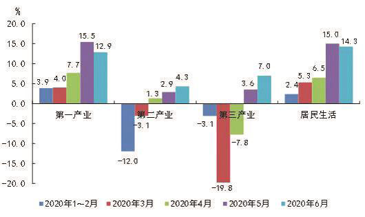 6月份,第一、二、三產(chǎn)業(yè)和居民生活用電量增速分別為12.9%、4.3%、7.0%和14.3%。其中,第二、三產(chǎn)業(yè)用電量增速較5月份分別回升1.4、3.5個百分點,生產(chǎn)經(jīng)營活動水平繼續(xù)提升,第一產(chǎn)業(yè)和居民生活用電量增速連續(xù)兩個月超過10%。上半年,三次產(chǎn)業(yè)和居民生活用電量增速分別為8.2%、-2.5%、-4.0%和6.6%,第二、三產(chǎn)業(yè)運行較去年仍有差距。