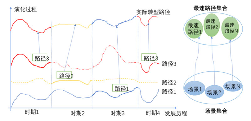當(dāng)能源轉(zhuǎn)型目標(biāo)確定后,其從轉(zhuǎn)型起點(diǎn)到轉(zhuǎn)型目標(biāo)間將有多種可行路徑,多樣性的轉(zhuǎn)型路徑將形成能源轉(zhuǎn)型路徑集合。為研判何種路徑更適合未來發(fā)展趨勢(shì),需進(jìn)行“最優(yōu)路徑”的選擇。
