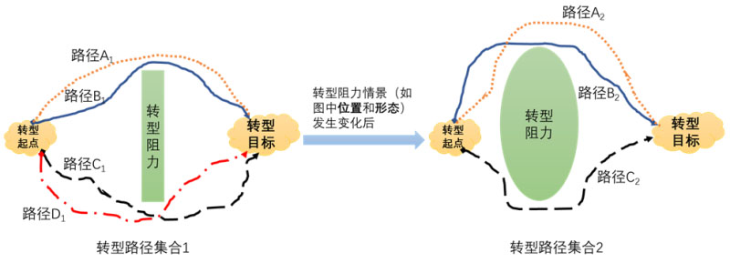 圖1展示了在相同轉(zhuǎn)型起點(diǎn)和轉(zhuǎn)型目標(biāo)下,不同轉(zhuǎn)型阻力對(duì)轉(zhuǎn)型路徑的影響。圖中左側(cè)場(chǎng)景下,有四條可行轉(zhuǎn)型路徑,當(dāng)內(nèi)外部環(huán)境發(fā)生改變后,僅有三條可行轉(zhuǎn)型路徑,且其具體路徑形態(tài)亦發(fā)生改變。