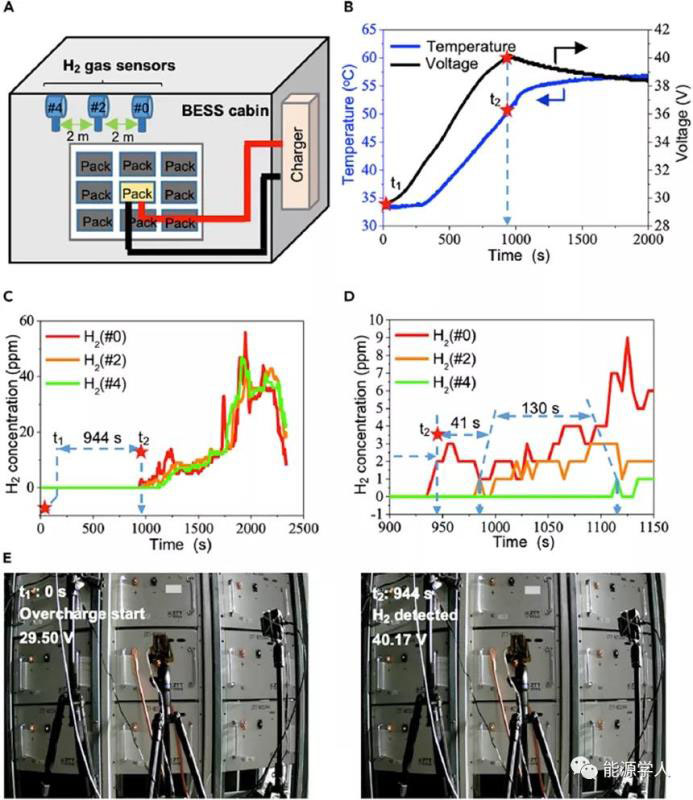 圖5 鋰電池組(9個電池組,79.2 kWh)的安全警告實驗。(a)真實BESS艙內(nèi)的實驗環(huán)境示意圖,三個H2氣體傳感器設(shè)置在不同的距離。(B)LiFePO4電池組在過充過程中的電壓分布和表面溫度變化。(C)三個傳感器0–2500 s的H2氣體濃度變化曲線;(D)三個傳感器放大的H2氣體濃度變化曲線900–1150s;(E)初始時間t1=0s和t2=994s時的光學(xué)圖像。