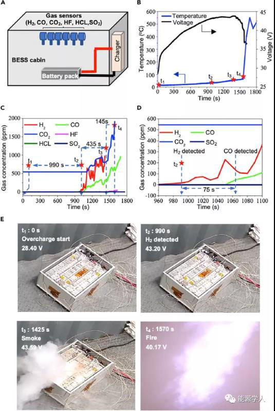 對商用電池組進行了過充電實驗,如圖4A所示。圖4B顯示了充電過程中的電壓分布和電池組表面溫度的變化。電池組持續(xù)過度充電而起火爆炸,約為43V(額定電壓值的1.68倍)。在此,實驗人員選擇了四個特殊的時間點來更好地闡述開發(fā)過程,即t1、t2、t3和t4。t1=0s為初始充電開始時間點;t2=990s為H2檢測時間點;t3=1425s為冒煙出現(xiàn)時間點;t4=1570s為火災(zāi)爆炸時間點。實驗中檢測到的六種氣體的濃度變化,如圖4C和4D所示。圖4E顯示了t1–t4不同時間點的光學(xué)圖像。