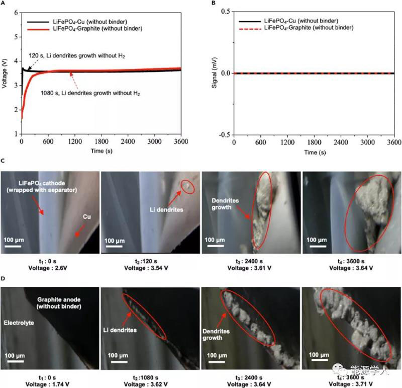 為了排除電解液還原及其他物質(zhì)的干擾,作者組裝了另外兩個鋰離子電池(LiFePO4-Cu和LiFePO4-石墨電池),沒有任何聚合物粘結(jié)劑。圖3A顯示了電池在充電過程中的電壓曲線。對于LiFePO4-石墨電池,在1080 s時觀察到鋰枝晶生長,電池電壓約為3.6 V。在LiFePO4-Cu電池,鋰離子直接鍍在銅箔表面形成鋰金屬。然而,由于光學(xué)顯微鏡觀察的局限性,在120s左右觀察到鋰枝晶生長,電池電壓約為3.6V。