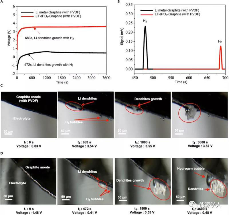 圖2C顯示了不同時間和電壓下,LiFePO4-石墨電池中,石墨負極的光學(xué)圖像。從683s到3600s,鋰枝晶繼續(xù)生長到微米尺度,并伴隨著H2氣泡。圖2D顯示了,不同時間和電壓下鋰金屬-石墨電池的光學(xué)圖像,和LiFePO4-石墨電池一樣,隨著鋰枝晶的生長,鋰枝晶底部產(chǎn)生H2氣體,鋰金屬與石墨電極中的聚合物粘結(jié)劑發(fā)生反應(yīng),聚集成大的H2氣泡。以上實驗結(jié)果表明,無論是在過充或正常充電條件下,一旦鋰枝晶開始與PVDF接觸,H2即會發(fā)生。