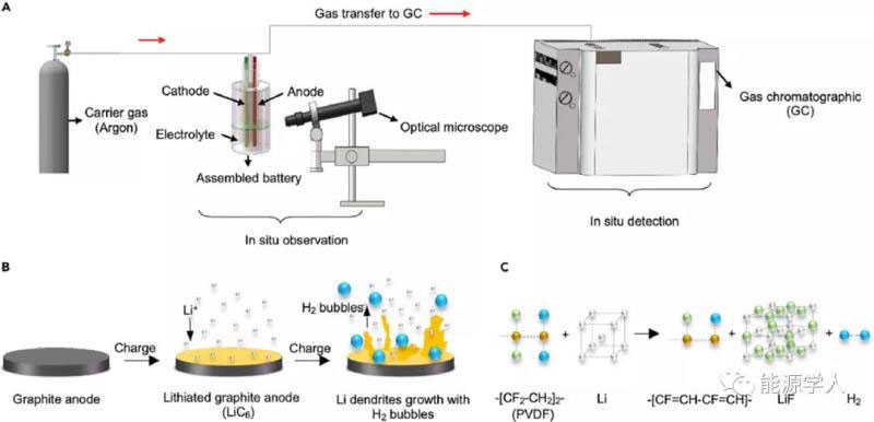 搭建了原位光學(xué)觀測和H2氣體捕獲平臺,演示了利用H2氣體捕獲檢測鋰枝晶生長的原理。如圖1A所示,密封在玻璃瓶中鋰離子電池,所產(chǎn)生的氣體進入氣相色譜儀并自動檢測。用光學(xué)顯微鏡可以同時記錄枝晶的形成行為。在正常情況下,鋰離子從正極中脫除,并以LiC6的形式嵌入石墨負極中。在過充電或快速充電條件下,鋰枝晶開始在石墨負極的鋰飽和部分生長,并與聚合物粘合劑發(fā)生反應(yīng),從而生成H2氣體(圖1B)。Li-PVDF反應(yīng)原理如圖1C所示。