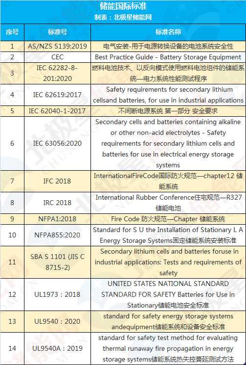 據(jù)北極儲能網(wǎng)不完全統(tǒng)計,目前我國現(xiàn)行標(biāo)準(zhǔn)體系中儲能及其相關(guān)產(chǎn)業(yè)鏈標(biāo)準(zhǔn)文件共計有160項,其中國家標(biāo)準(zhǔn)51項,行業(yè)標(biāo)準(zhǔn)60項,企業(yè)或地方標(biāo)準(zhǔn)49項 。關(guān)于儲能標(biāo)準(zhǔn)體系建設(shè),美國、澳大利亞等主要國家都在積極探索,目前常用的儲能國際標(biāo)準(zhǔn)主要有14項。中國國內(nèi)的儲能標(biāo)準(zhǔn)主要涉及了儲能系統(tǒng)、儲能電池及儲能應(yīng)用等方面,但對并網(wǎng)調(diào)試、產(chǎn)品檢測、尤其是消防安全、運維管理等方面仍有欠缺。