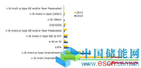 總體來看,這兩種主流晶體硅類型電池在2010年和2013年的市場(chǎng)份額幾乎不變,都是接近82%。不同的是多晶硅在里面的份額總2010年的52%增加到了64%。因此,幾乎有2/3的太陽能電池安裝都是在使用同一種已經(jīng)應(yīng)用了長達(dá)15年的技術(shù),這其中僅僅是只是采用或者說給予了漸進(jìn)式的技術(shù)改進(jìn)而無變革。這似乎是對(duì)技術(shù)改革派的一個(gè)警鐘。同樣也揭示了為什么2013年大部分太陽能電廠都安裝多晶硅組件。