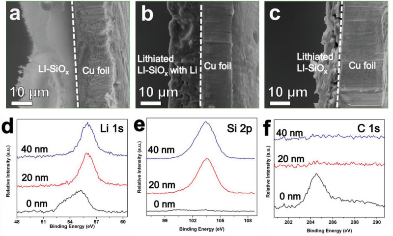 圖6. Li-SiOx包覆Cu箔的SEM側視圖及XPS表征(a) 嶄新的Li-SiOx包覆Cu箔SEM側視圖;(b) 經過2 mAh cm?2 Li沉積后的Li-SiOx包覆Cu箔SEM側視圖;(c) Li脫出后的Li-SiOx包覆Cu箔SEM側視圖,白色虛線為邊界線;(d-f) Li-SiOx包覆Cu箔全電池100圈循環(huán)后的XPS表征。