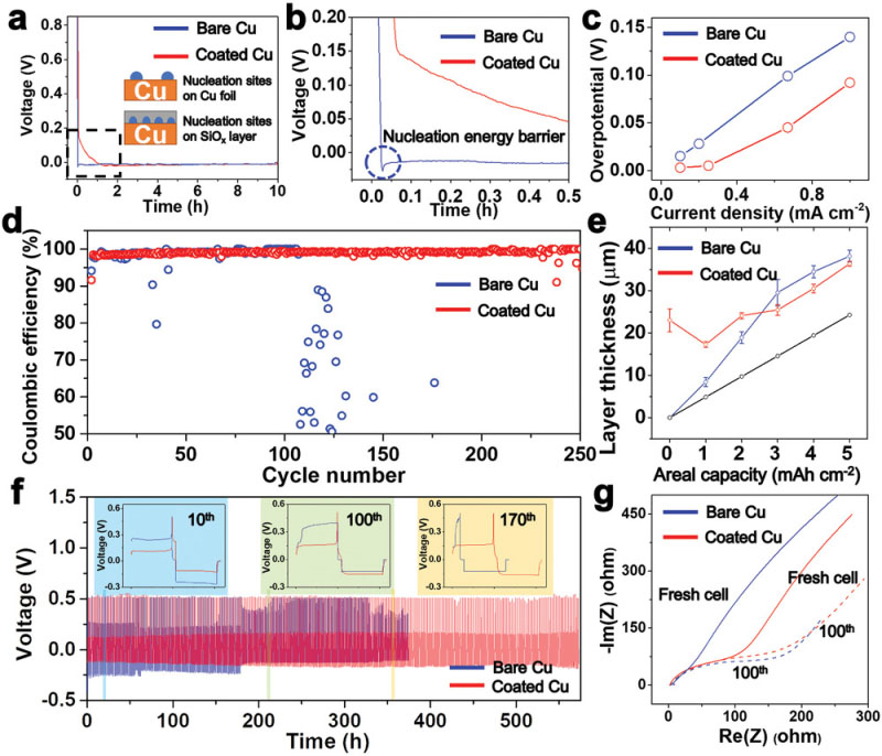 圖3. 由Li-SiOx薄層包覆后的Cu箔組裝的半電池電化學性能測試(a,b) 0.1 mA cm-2電流密度下裸露Cu箔和Li-SiOx包覆Cu箔的電壓曲線,Cu箔表面的藍色圓點代表成核位點;(c) 不同電流密度下裸露Cu箔和Li-SiOx包覆Cu箔的Li成核過電勢;(d) 2.0 mA cm-2電流密度下裸露Cu箔和Li-SiOx包覆Cu箔的庫倫效率;(e) 不同面積比容量下裸露Cu箔和Li-SiOx包覆Cu箔的Li沉積厚度,黑線表示理論沉積厚度;(f) 2.0 mA cm-2電流密度下裸露Cu箔和Li-SiOx包覆Cu箔的電壓曲線;(g) 由裸露Cu箔和Li-SiOx包覆Cu箔組裝半電池循環(huán)前和循環(huán)100圈后的Nyquist圖。