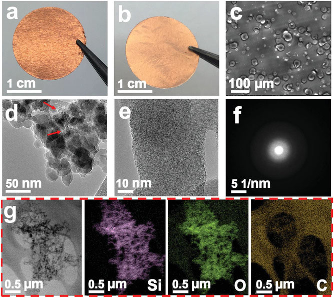 圖2. 包覆前后Cu箔與循環(huán)后Li-SiOx的表征(a) 裸露Cu箔的光學照片;(b) 包覆Li-SiOx后Cu箔的光學照片;(c) Li-SiOx薄層的SEM頂視圖;(d) Li-SiOx顆粒的TEM表征,紅色箭頭表示激光誘導產生的石墨;(e) Li-SiOx顆粒的HR-TEM表征;(f) Li-SiOx顆粒的SAED圖像(g) Li-SiOx顆粒的STEM圖像,紫色:Si;綠色:O;黃色:C。