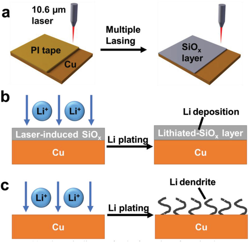 圖1. 在PI膠帶上利用激光誘導沉積SiOx薄層及后續(xù)Li沉積示意圖(a) 在Cu集流體表面利用激光形成SiOx薄層示意圖;(b) Li離子在SiOx薄層包覆后的Cu箔表面沉積示意圖;(c) Li離子在裸露的Cu箔表面沉積示意圖。