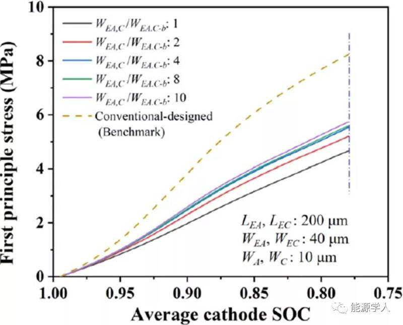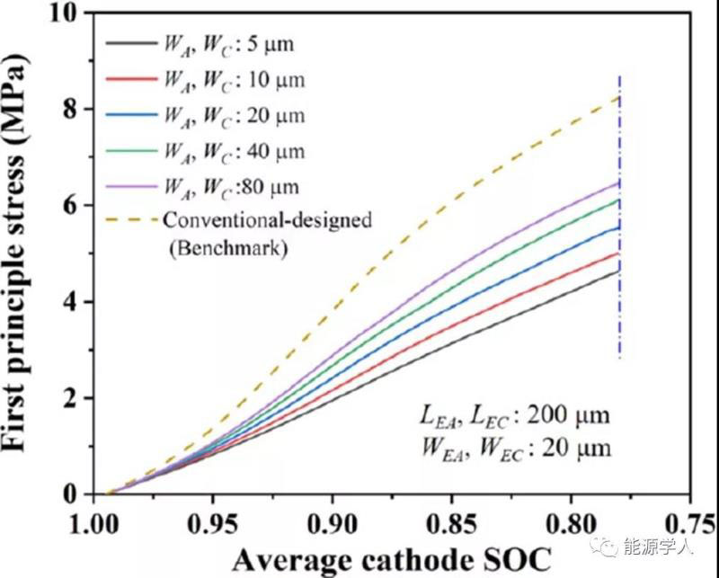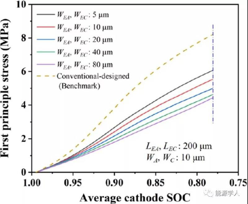 圖8 在陰極/隔膜界面處陰極主應(yīng)力與SOC的關(guān)系。顯示增加電解質(zhì)通道的寬度(WEA和WEC)可以顯著降低陰極應(yīng)力。