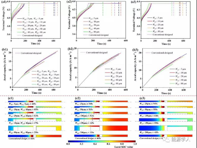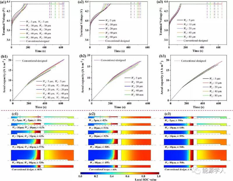 電解液通道寬度的影響。同時(shí)存在陰、陽極通道的電池,當(dāng)WEA和WEC均為10μm時(shí),出現(xiàn)最大CCCV充電時(shí)間(圖6a1),對(duì)應(yīng)最大面容量(圖6b1)。只有一個(gè)電極有通道時(shí),當(dāng)WEA =10μm或WEC=20μm時(shí),出現(xiàn)最大CCCV充電時(shí)間(圖6a2和6a3),對(duì)應(yīng)面積容量的最大值(圖6b2,6b3)。陰/陽極同時(shí)具有電解液通道的電池,適當(dāng)?shù)耐ǖ缹挾龋╓EA和WEC)可以使陽極材料的SOC分布更加均勻(圖6c1)。對(duì)于陰極而言,當(dāng)WEA和WEC超過20μm時(shí),不利于Li+脫出。