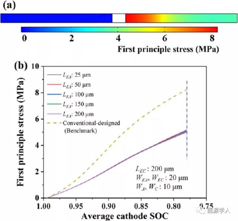 圖5 (a)常規(guī)設(shè)計(jì)電池第一主應(yīng)力分布(b)對(duì)于常規(guī)設(shè)計(jì)的電池和不同陽極通道長度的電池,陰極/隔膜界面處電極上的主應(yīng)力與SOC的關(guān)系。