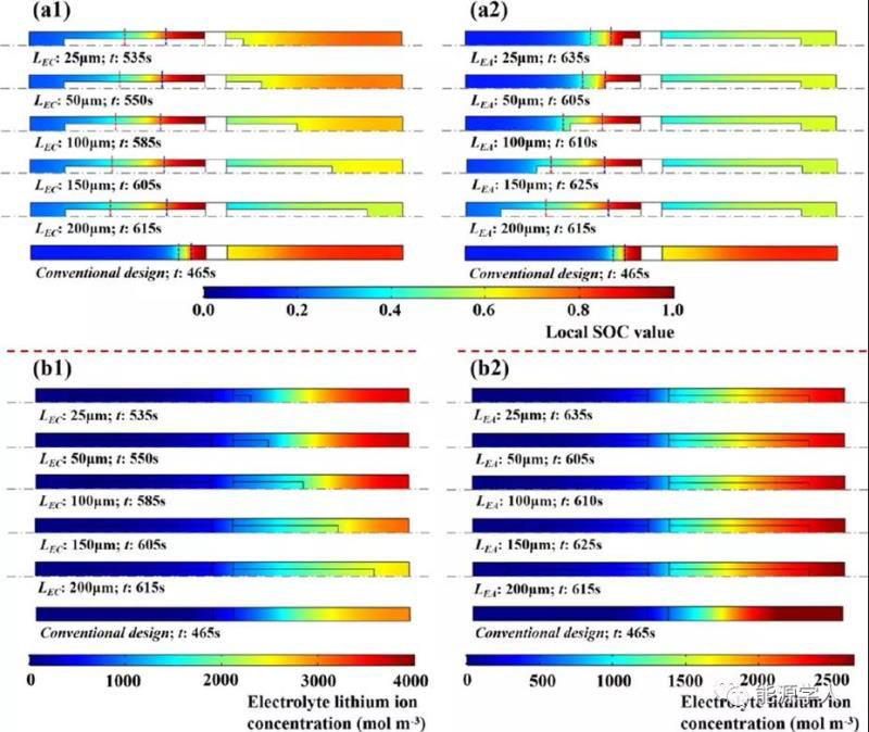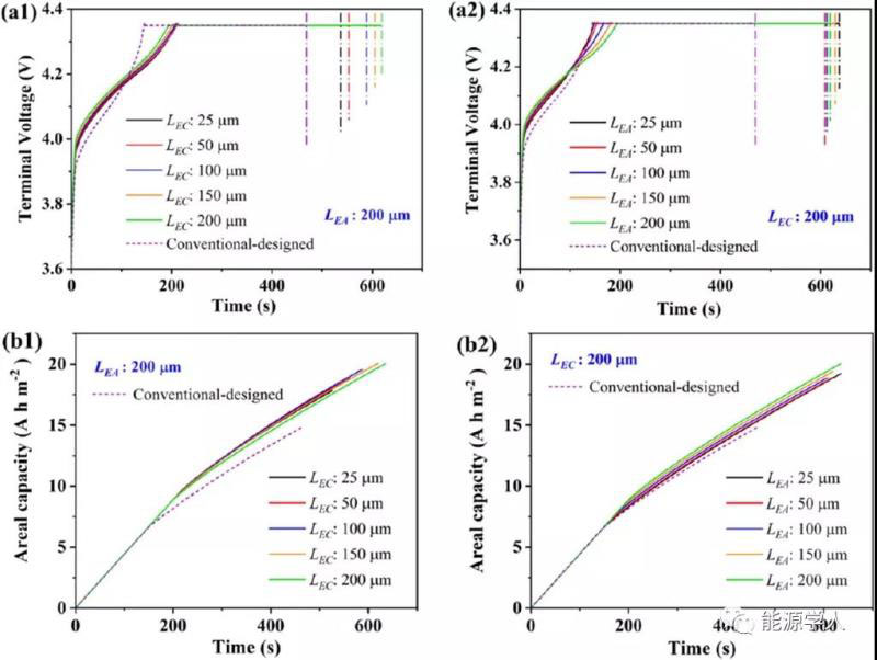 電解液通道長度的影響。圖2a1顯示,當(dāng)LEA固定時(shí),CC充電時(shí)間隨LEC略有減少,CV充電時(shí)間顯著增加。圖2b1顯示,面積容量隨LEC單調(diào)增加。圖2a2顯示,當(dāng)LEC固定時(shí),CC充電時(shí)間隨LEA增加而CV充電時(shí)間隨之減少。如圖2b2所示,面積容量先減小后增加。當(dāng)LEA達(dá)到200μm時(shí),最大的面積容量為20.02 Ah m-2。高于常規(guī)設(shè)計(jì)電池的面積容量。