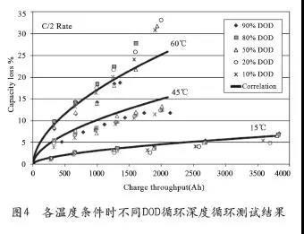 圖4為鋰電池分別在15℃、45℃和60℃環(huán)境溫度條件下,采用不同DOD循環(huán)深度放電時(shí)的測試數(shù)據(jù),可以看到,不同DOD循環(huán)深度對鋰電池壽命影響很小。因此DOD循環(huán)深度不適宜作為一種加速衰減方法。