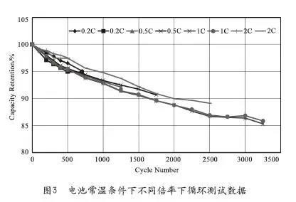 對于磷酸鐵鋰電池來說,如果設(shè)計(jì)得當(dāng),倍率完全可以不成為壽命影響的主要因素。圖3為電池常溫條件下不同倍率下循環(huán)測試數(shù)據(jù),可以看到,循環(huán)壽命幾乎不受倍率的影響,基本上只與循環(huán)次數(shù)相關(guān)。因此大倍率測試可以作為一種節(jié)省時(shí)間的方法,不適宜作為一種加速衰減方法。