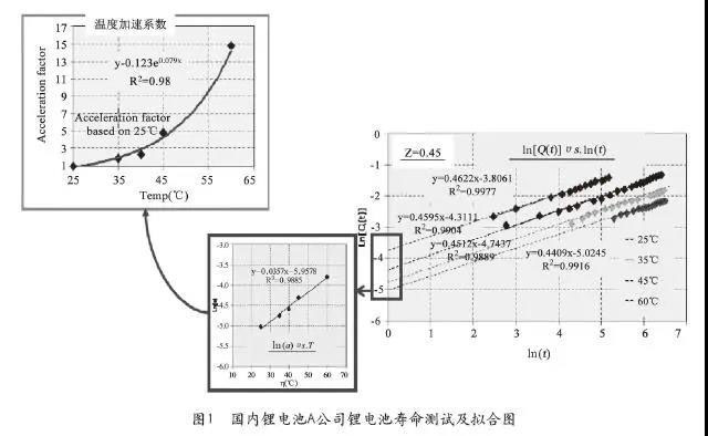 以上公式是否適用于鋰電池的壽命分析,可以通過測試進(jìn)行驗(yàn)證。圖1是國內(nèi)鋰電池A公司用式(1)和式(2)進(jìn)行的測試和鋰電池壽命推導(dǎo)過程。通過對鋰電池在25℃、35℃、45℃和60℃分別進(jìn)行的容量測試結(jié)果分析,得到了該電池的溫度加速系數(shù)的擬合曲線。從測試和推導(dǎo)過程來看,最終的擬合曲線比較好的反映了測試結(jié)果。