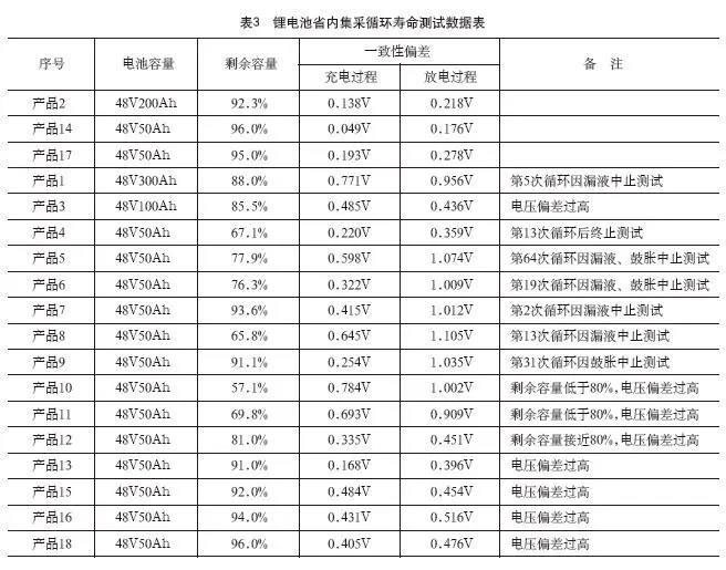 2014年某運(yùn)營商集團(tuán)第一次集采磷酸鐵鋰電池,以下是集中采購鋰電池進(jìn)行的質(zhì)量測試情況。測試方法:在55℃環(huán)境溫度條件下,對鋰電池組以0.5C電流進(jìn)行充電,以1C電池進(jìn)行放電,共進(jìn)行100次充放電循環(huán)測試。測試結(jié)果如表3所示。
