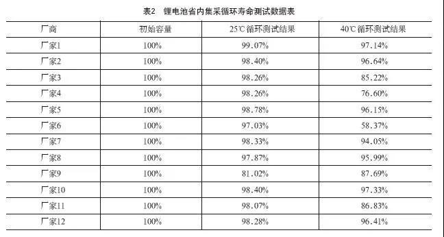 2013年某運(yùn)營商省公司第一次集采磷酸鐵鋰電池,以下是某省公司集中采購鋰電池進(jìn)行的質(zhì)量測試。測試方法:分別在25℃和40℃環(huán)境溫度條件下,對鋰電池組以0.2C電流進(jìn)行充電,以0.55C電流進(jìn)行放電,共進(jìn)行100次充放電循環(huán)測試。測試結(jié)果如表2所示。