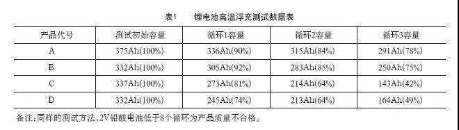 2011年運(yùn)營商開始批量使用鋰電池,在應(yīng)用的同時(shí)進(jìn)行了鋰電池高溫浮充測試。測試方法為在60℃環(huán)境溫度下,磷酸鐵鋰電池以3.6V電壓連續(xù)充電30天,然后在25℃環(huán)境溫度下進(jìn)行一次充放電循環(huán)核對剩余容量;或者在55℃環(huán)境溫度下,磷酸鐵鋰電池以3.6V電壓連續(xù)充電42天,然后在25℃環(huán)境溫度下進(jìn)行一次充放電循環(huán)核對剩余容量。測試了4個(gè)產(chǎn)品,結(jié)果如表1所示。