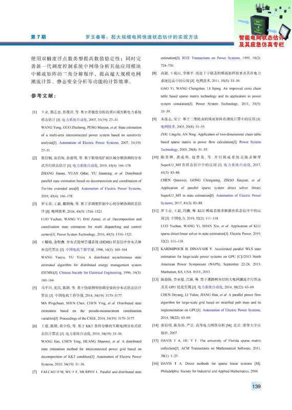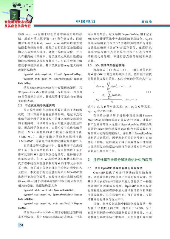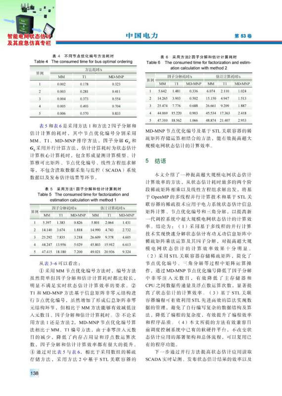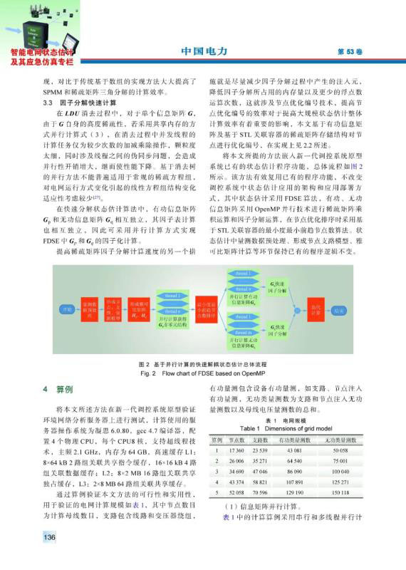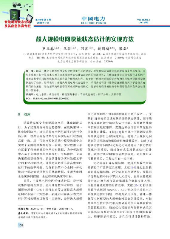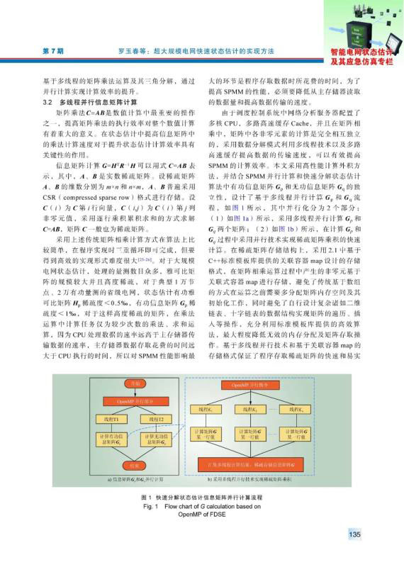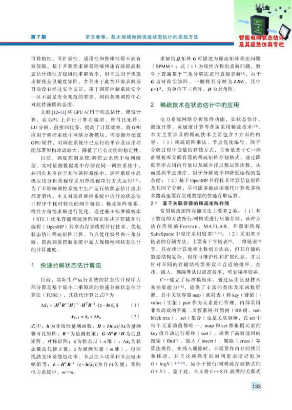 隨著一體化互聯(lián)大電網(wǎng)全局分析決策中心的建設(shè),對(duì)實(shí)時(shí)狀態(tài)估計(jì)計(jì)算速度提出了更高要求。采用多線程并行計(jì)算技術(shù)實(shí)現(xiàn)了快速分解狀態(tài)估計(jì)信息矩陣的快速計(jì)算,在稀疏矩陣節(jié)點(diǎn)優(yōu)化編號(hào)及其因子分解過(guò)程中采用標(biāo)準(zhǔn)模板庫(kù)關(guān)聯(lián)容器存儲(chǔ)稀疏矩陣?;谛乱淮{(diào)控系統(tǒng)驗(yàn)證環(huán)境和實(shí)際電網(wǎng)拼接模型算例進(jìn)行了驗(yàn)證。結(jié)果表明:在超大規(guī)模電網(wǎng)狀態(tài)估計(jì)中,采用多線程并行計(jì)算信息矩陣及其因子分解具有較高的加速比,結(jié)合基于關(guān)聯(lián)容器的稀疏矩陣存儲(chǔ)格式,能夠有效提升編程效率和程序品質(zhì)以及狀態(tài)估計(jì)的計(jì)算效率。