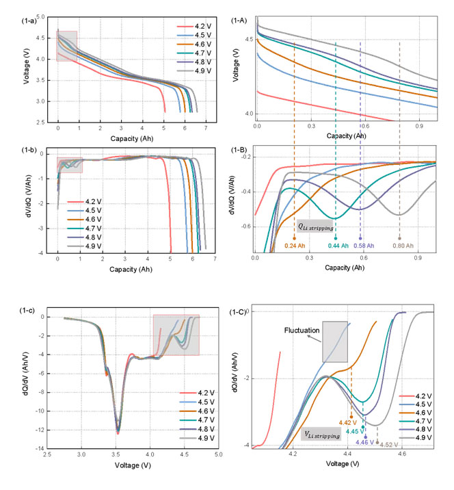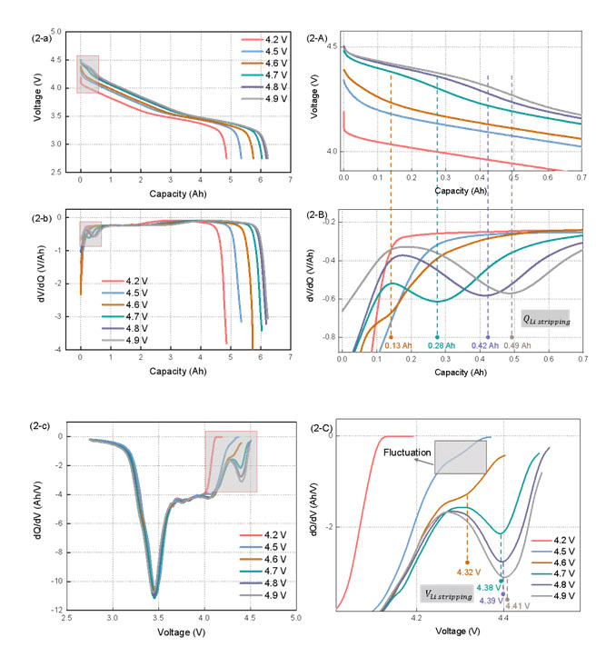 圖 1展示了在0.2 C和0.5 C放電4.2 V,4.5-4.9V下,電壓與容量的關(guān)系、差分電壓和差分容量的結(jié)果。以0.5 C為例進(jìn)行分析:從圖 1(2-a/A)中可以看出,4.7 V,4.8 V和4.9 V三個過充截止電壓下在放電初期出現(xiàn)了一段高電壓平臺,我們認(rèn)為是鋰溶解電壓平臺,對放電曲線進(jìn)行差分電壓和差分容量,如果二者出現(xiàn)極小值,則說明發(fā)生析鋰。