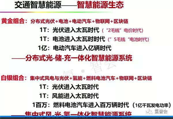 未來智慧能源生態(tài)將有兩個組合:一個是黃金組合——分布式光伏+電池+電動汽車+物聯(lián)網(wǎng)+區(qū)塊鏈;光伏進入2毛錢電價,電池將會進入5毛錢一瓦時的時代,電動汽車進入了億輛時代;還有一個是白銀組合,就是集中式風電與光伏+氫能+燃料電池汽車+物聯(lián)網(wǎng)+區(qū)塊鏈。