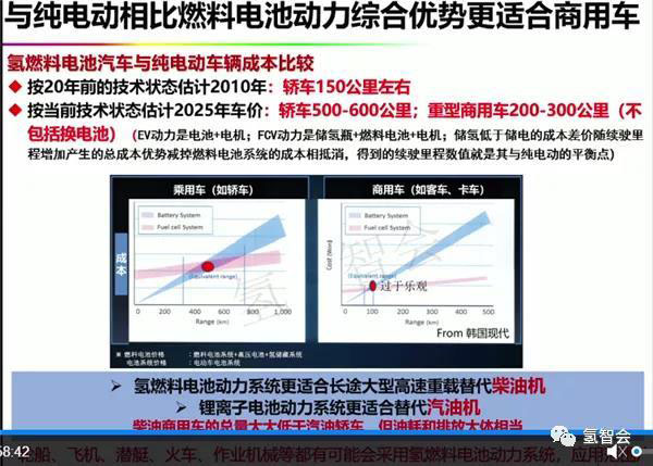 所以基于可再生能源,純電動和氫燃料電池優(yōu)勢凸顯。再看氫燃料電池和純電動車輛成本比較:20年前剛開始搞電動汽車專項時,按照當時的技術狀態(tài),估計2010年純電動轎車只能跑150公里,150公里以上燃料電池就有優(yōu)勢。但是按照現(xiàn)在的狀態(tài)估計2025年車價,純電動轎車500-600公里內(nèi)都有成本優(yōu)勢。但是重型商用車,氫燃料電池300以上就有優(yōu)勢(這里不考慮換電重卡)。