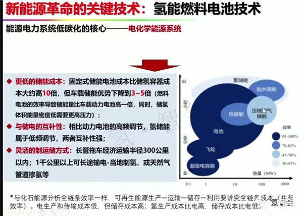 另外一個就是氫能燃料電池技術,應該也取得了一定程度的突破。根據(jù)儲能裝置的特性,目前的基本共識是:動力電池是分布式、短周期儲能的最佳選擇;而長周期、大規(guī)模儲能要靠氫能;在車下固定式儲能,氫能的成本比電池儲電要低一個數(shù)量級(當然車上不是這樣,車上沒地方放,只好高壓,成本就上去了),而且可以大規(guī)模、長周期儲能。另外儲氫和儲電互補。第三,運儲方式也比較靈活,例如不一定要在新疆集中式可再生能源基地制氫,也可以在北京,對穩(wěn)定電網(wǎng)無論哪里都一樣。總之,氫是集中式可再生能源大規(guī)模、長周期儲存的最佳途徑,一旦可再生能源成本降低,如果到0.1元一度電,儲存成本在總成本中間占的比例就最大,那時候它的優(yōu)勢就出來了,這是它存在的合理性。