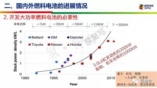 我們認(rèn)為開發(fā)大功率燃料電池的必要性。原來(lái)的燃料電池主要是功率密度低,造成整個(gè)成本比較高。而從95年到現(xiàn)在整個(gè)的功率大概是從最初的單堆7千瓦到后來(lái)Daimler出現(xiàn)114千瓦,整個(gè)增加了30倍左右。大功率的燃料電池為什么需要?因?yàn)槲覀冎乐乜āC(jī)車、船舶功率需求都是300千瓦到1000千瓦以上,乘用車至少2.0升大概也需要100千瓦,如果100千瓦電堆做不出來(lái)的話,必須要靠鋰電池提速還是有一定的問題的。
