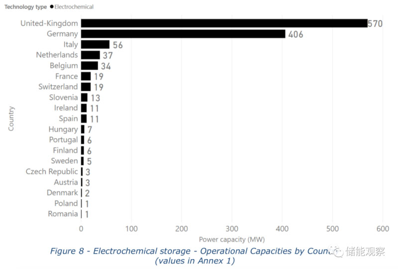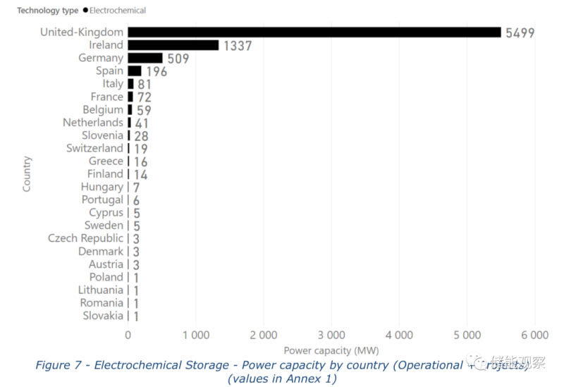 抽水蓄能在數(shù)據(jù)庫中占主導(dǎo)地位,但每個國家的項目總數(shù)也取決于較小的項目,通常是電化學設(shè)施,其中, 英國電化學設(shè)施占總項目的90%以上,其次是愛爾蘭和德國。