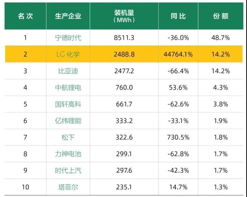 與2019年同期相比,除寧德時代的名次仍在榜首,其他企業(yè)名次均有變化,中航鋰電升幅最大,從第八升至第四;力神降幅最大,從第四降至第八。比亞迪從第二跌至第三,國軒高科從第三降至第五,億緯鋰能從第五降到第六,時代上汽從第七降至第九。而孚能科技、比克、多氟多被淘汰出前十。
