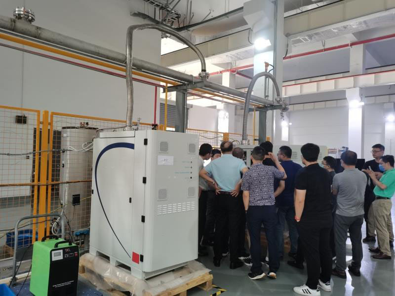 座談結(jié)束后,蔡信帶著調(diào)研團參觀了公司,并向調(diào)研團專家展示了公司5KW燃料電池熱電聯(lián)產(chǎn)系統(tǒng)的組成模塊、產(chǎn)品性能、系統(tǒng)優(yōu)勢和安裝場景,并介紹了產(chǎn)品的國內(nèi)外市場情況以及公司產(chǎn)業(yè)化和低成本化的定位。5kW產(chǎn)品電功率5kW,同時具備最大熱功率7.5kW。系統(tǒng)內(nèi)部集成天然氣重整制氫模塊,只需接入天然氣即可正常工作,在目前氫能基礎設施建設相對薄弱的現(xiàn)狀下,具有較為廣泛的場景適應性。系統(tǒng)電功率35%,熱功率54-57%,熱電聯(lián)產(chǎn)總效率高達90%。公司目前已簽訂訂單價值千萬元,年底將交付數(shù)十套系統(tǒng)給客戶。