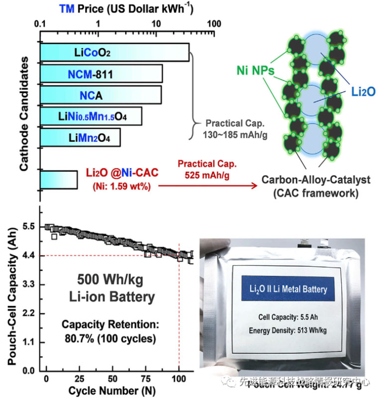 南京大學Haoshen Zhou教授研究團隊設計開發(fā)了一種穩(wěn)定的、大容量基于陰離子氧化還原活性的正極材料體系,應用于鋰金屬(Li)軟包全電池,通過氧化鋰(Li2O)與過氧化鋰(Li2O2)之間的可逆轉(zhuǎn)化,顯著提升了電池器件的性能,首次獲得了超越500 Wh/kg的能量密度,且電池穩(wěn)定循環(huán)100余次后仍可獲得大于400 Wh/kg的能量密度,更為關(guān)鍵的是該電池鎳金屬的含量僅為1.59%(質(zhì)量分數(shù)),遠低于傳統(tǒng)的高鎳三元正極,成本更低更適于規(guī)?;a(chǎn),對電池產(chǎn)業(yè)和電動汽車發(fā)展具有重要推動作用。相關(guān)的研究表明,在Li金屬電池正極材料的設計過程中,不局限于傳統(tǒng)過渡金屬氧化還原提供容量,利用Li2O與Li2O2之間的可逆轉(zhuǎn)化,能夠為正極體系提供很高的能量密度。理論計算得知,Li2O/Li2O2轉(zhuǎn)化的理論能量密度高達2565 Wh/kg。為此研究人員利用濕化學法制備了Li2O基正極材料,同時為了提升無氧氣析出的“安全”充電深度,研究人員同時制備了匹配的鎳基碳合金導電催化框架(Ni-CAC)包覆Li2O形成Li2O@Ni-CAC電極體系,一方面有助于提升電池性能,另一方面有利于減少鎳金屬使用量降低成本。接著以Li2O@Ni-CAC和Li為正負極,醚類溶劑為電解質(zhì)組裝成完整的軟包電池,并開展電化學性能測試。原位氣相質(zhì)譜和拉曼光譜實驗顯示,在充電過程中存在明顯的Li2O向Li2O2的轉(zhuǎn)化過程,且Li2O@Ni-CAC電極體系的可逆“安全”充電深度為750 mAh/g(基于Li2O活性物質(zhì)質(zhì)量),一旦超過這一數(shù)值就會出現(xiàn)不可逆的氧氣析出。隨后控制充電深度不超過750 mAh/g,進行充放電循環(huán)測試,發(fā)現(xiàn)電池可以穩(wěn)定可逆循環(huán)100余次,且能量密度高達950 Wh/kg(考慮到所有電極材料質(zhì)量的前提下,但不包括軟包外殼);而在計入軟包外殼后,電池依然獲得了超越500 Wh/kg的能量密度,達到了513.5 Wh/kg,這是目前文獻報道的能量密度最高的軟包電池(計入整個軟包電池質(zhì)量后),且電池穩(wěn)定循環(huán)100余次后,輸出能量密度仍然高于400 Wh/kg,表現(xiàn)出優(yōu)異的循環(huán)穩(wěn)定性。