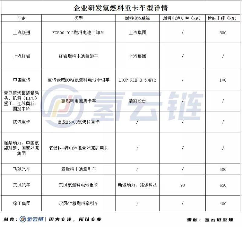 氫云鏈據(jù)公開(kāi)信息統(tǒng)計(jì)到,目前國(guó)內(nèi)車(chē)企成功開(kāi)發(fā)燃料電池重卡車(chē)型的有上汽、陜汽、中國(guó)重汽、飛馳汽車(chē)、徐工集團(tuán)等車(chē)企;而車(chē)型方面,擁有燃料電池牽引車(chē)、自卸車(chē)和礦用卡車(chē)等;