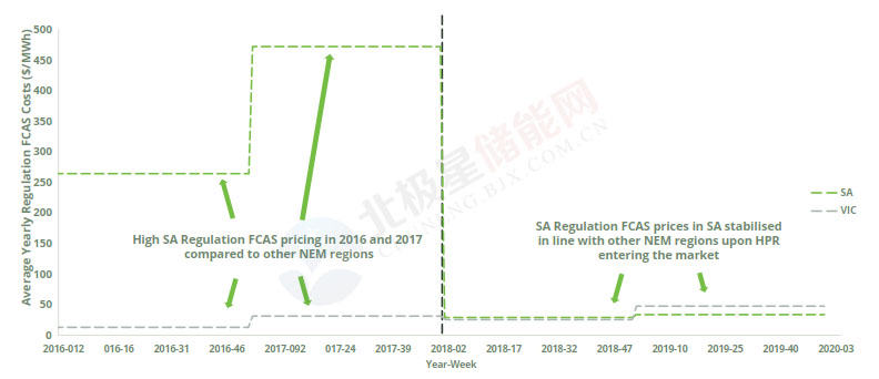 5. 在將該儲能項目引入調(diào)頻輔助服務(wù)市場后,南澳大利亞州發(fā)電機(jī)的年平均調(diào)頻輔助服務(wù)成本從最高的470美元/MWh降至不到40美元/MWh,并保持到目前的水平,大大節(jié)省了南澳大利亞州的能源成本。