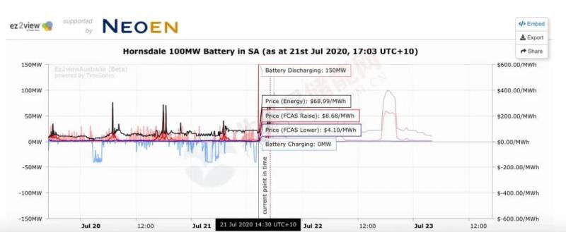 當(dāng)?shù)貢r間7月21日下午2點21分左右,被稱為“霍恩斯代爾電力儲能項目”的電池儲能系統(tǒng),向南澳大利亞電網(wǎng)供電150MW、實現(xiàn)滿負(fù)荷運行,創(chuàng)下了新的世界紀(jì)錄。根據(jù)儲能系統(tǒng)所有者Neoen的聲明,這代表了該電池系統(tǒng)的儲能功率和容量已提高了50%、達(dá)到該儲能系統(tǒng)的最大發(fā)電能力。