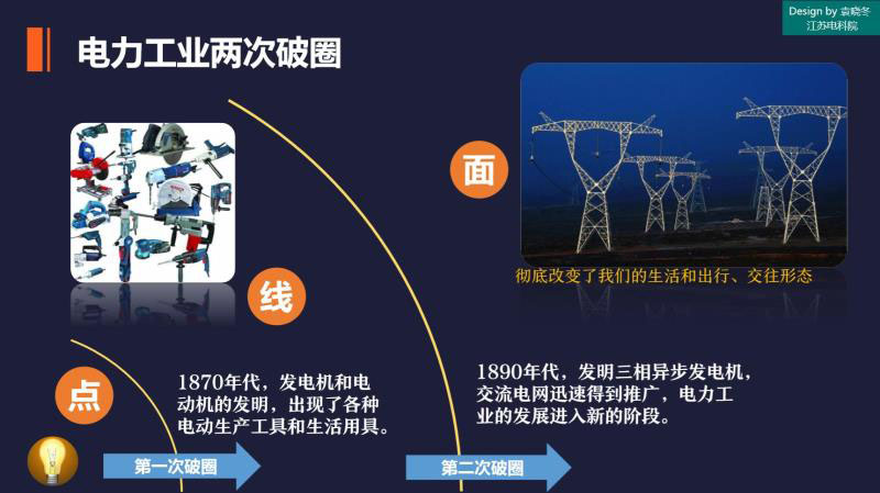 第二次破圈大概發(fā)生在1890年的時(shí)候,主要是發(fā)明了三相異步發(fā)電機(jī),電力工業(yè)的發(fā)展就到了一個(gè)新的階段,有沒有想過電力發(fā)展是這樣過來的?其實(shí)不是因?yàn)橛辛穗姡R上就有了電網(wǎng),中間是兩次破圈之后有了電網(wǎng),而有了電網(wǎng)之后徹底改變我們的生活和出行,包括我們所有交往的形態(tài)。后面有了飛機(jī),現(xiàn)在有了高鐵,如果沒有強(qiáng)大的電網(wǎng)在后面撐著,我們的高鐵其實(shí)是不可能跑起來的。高鐵都是接入220千伏的電網(wǎng),這么大的沖擊容量,如果沒有后端的強(qiáng)大電網(wǎng)支撐,它是跑不起來的。所以前端必須是先被破圈之后,可能才有高鐵,所以在這個(gè)之前,大家再大的想象力可能也想不出高鐵這個(gè)東西。這就是行業(yè)在破圈之后,應(yīng)用范圍會(huì)做巨大的漣漪式擴(kuò)散。