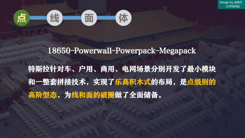 在點(diǎn)這件事上,我認(rèn)為特斯拉其實(shí)是做到了極致,從18650到Powerwall億到Powerpack到Megapack,就實(shí)現(xiàn)了一個(gè)樂高積木式的布局,是一個(gè)點(diǎn)級(jí)別最高的形態(tài),也是為后面的破圈做了全面的儲(chǔ)備。