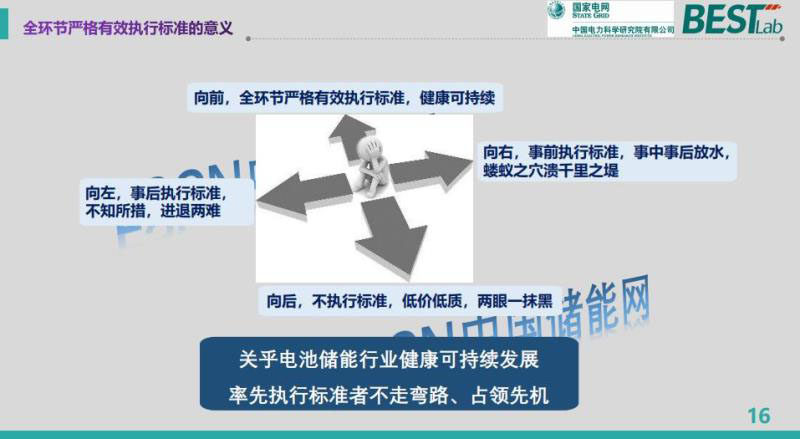 最后想說一點,當前儲能行業(yè)又來到了一個發(fā)展的十字路口,前后左右。向前,就是全環(huán)節(jié)嚴格有效執(zhí)行標準,儲能行業(yè)健康可持續(xù)發(fā)展可期;向后,不執(zhí)行標準,就是繼續(xù)低價低質(zhì)惡性競爭;向左,就是事前不執(zhí)行標準,事后才想起來執(zhí)行標準,將會陷入進退兩難的境地;向右,是另一個極端,事前執(zhí)行標準,事中事后不執(zhí)行標準,這個前面的環(huán)節(jié)就沒有多大意義了,后面相當于放水了,一定是漏洞百出。所以我覺得全環(huán)節(jié)嚴格有效執(zhí)行標準的事兒,是關(guān)乎電池儲能行業(yè)健康可持續(xù)發(fā)展的一件事,率先執(zhí)行標準會少走彎路、占領(lǐng)先機,因為最終都是要標準化的。從前面講的型式試驗結(jié)果,大家可以梳理一下,有幾家是從單體、模塊、簇全部都打通了,全體系產(chǎn)品都拿到型式試驗報告了,這是一種先知先覺聰明的做法。